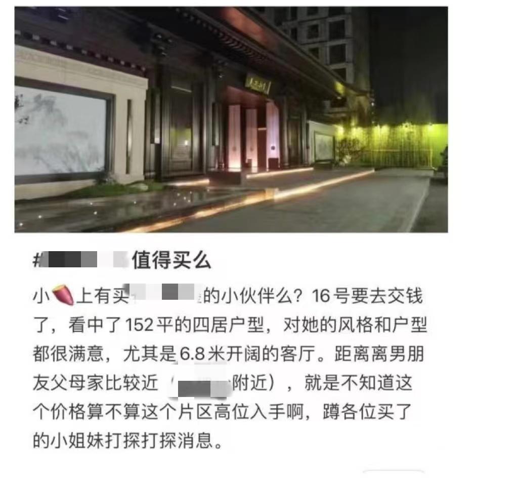 “16号要去交钱了,看中了152平的四居户型,对风格和户型都比较满意……蹲各位买了的小姐妹打探打探消息。”该博主在社交平台上表示。