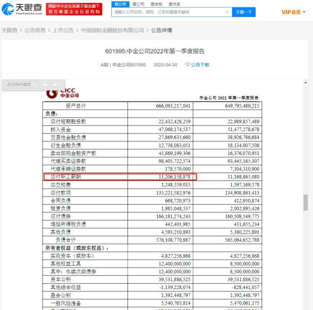 据公开信息,中金公司2022年第一季度报告显示,中金公司一季度应付职工薪酬超112亿人民币。