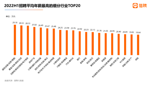 猎聘发布的《2022上半年中高端人才就业趋势报告》中提到,薪资方面,通信(设备/运营/增值)、基金/证券/期货/投资、互联网/移动互联网/电子商务位居前三,