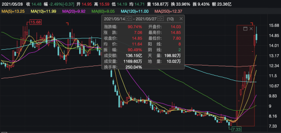 随后形势突然逆转,5月14日迎来久违的券商板块集体大涨行情,10股涨停,包括华创阳安、浙商证券、光大证券、中金公司、中信建投、国盛金控、中泰证券、国联证券、财达证券、湘财股份,东方财富收涨12.79%。