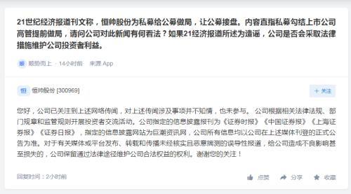 值得一提的是,受公私募联动接盘传闻的影响,恒帅股份1月19日跌停收盘。针对公募集体买入恒帅股份为私募接盘传闻,恒帅股份1月19日在深交所“互动易”平台回答投资者提问时称:公司已关注到上述网络传闻,对上述传闻涉及事项并不知情,也未参与。