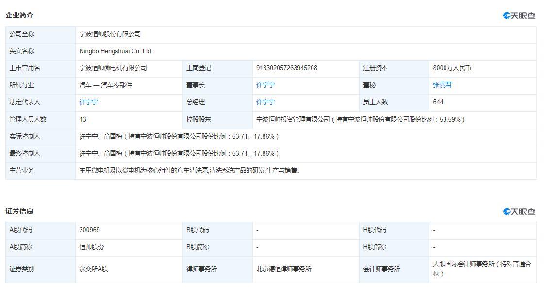 天眼查APP显示,宁波恒帅股份有限公司主要从事车用微电机及以微电机为核心组件的汽车清洗泵、清洗系统产品的研发、生产与销售,致力于成为全球领先的汽车微电机技术解决方案供应商。公司目前主要产品为各类车用微电机及以微电机为核心组件的汽车清洗泵、清洗系统等产品。