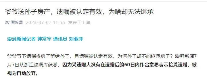 一位90后小伙子小陈的爷爷在公证处办理了遗嘱,写明了名下房产在他百年后由小陈继承。然而,小陈的叔叔和姑姑认为他们是法定继承人,理应继承这套房子中属于他们的份额,因为他们没有在订立遗嘱时在场。最终,双方闹上法院,法院判决遗嘱有效,但小陈还是不能继承爷爷遗赠的该房产。浙江遗嘱库工作人员向小陈解释,依照法律,他不属于法定继承人,但陈爷爷可以通过遗嘱的方式将遗产给他,即遗赠。遗嘱继承优于法定继承。但需要注意的是,受遗赠人须在知道受遗赠后的60日内作出意思表示接受遗赠,否则被视为自动放弃,按照法定继承办理。而小陈接受陈爷爷遗赠的时间已超过60天,因此房子由法定继承人来继承。