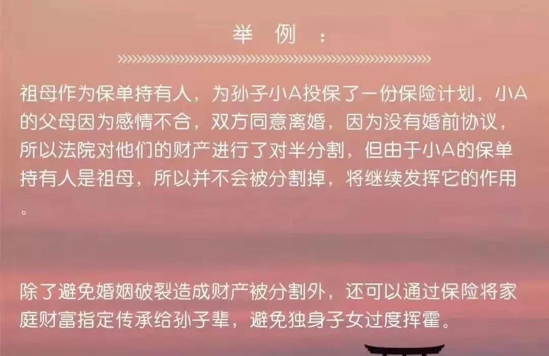 2、隔代投保也可以实现资产隔离的目的。在社会变化迅速的今天,婚姻关系变得越来越不牢固。为了避免因婚姻破裂而导致财产分割或经济困难,保险的功能可以传承给孙辈,以防患未然。