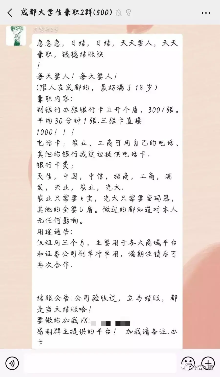 这些求职者被野鸡公司或街头摆地摊的招聘公司所迷惑,以上交身份证办理银行卡发工资等各种理由,凑齐“四件套”,这些野鸡公司就莫名其妙消失了。