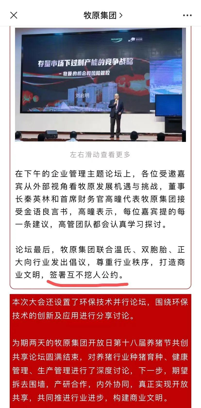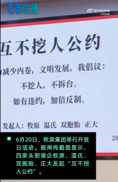 此前媒体报道称,一位与会人士透露,牧原作为养猪规模最大的企业,被其他公司从团队挖走不少专业技术人才,才发起了这个公约。