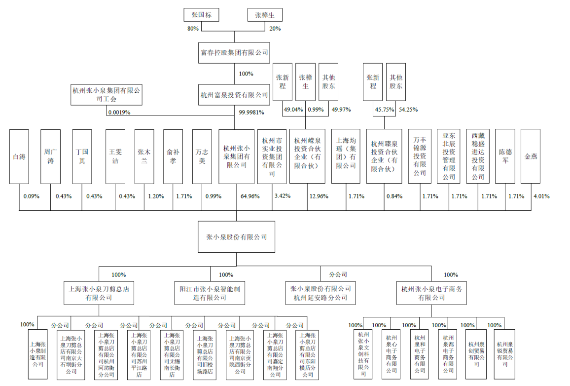 IPO前,张国标通过张小泉集团间接持股51.96%,张樟生通过嵘泉投资和张小泉集团合计间接持股13.12%;张新程通过嵘泉投资和臻泉投资合计间接持股6.75%。