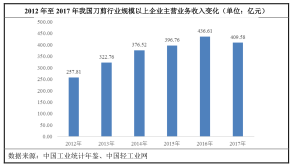 招股书显示,近年来,我国刀剪行业企业在规模、管理、效益,产品种类、质量和工艺技术等方面,都有大幅的提升。根据《中国工业统计年鉴》历年数据,我国规模以上刀剪行业主营业务收入从2012年的257.81亿元增长至2017年的409.58亿元,年复合增长率达 10%。
