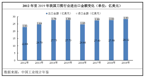 出口方面,2019 年刀剪行业实现商品进出口总额 30.25 亿美元,其中:出口总额 28.32 亿美元,进口总额 1.93 亿美元。