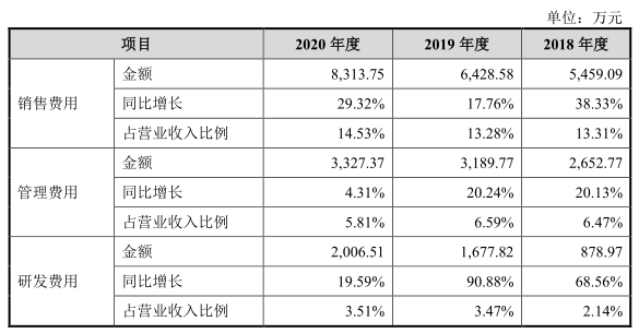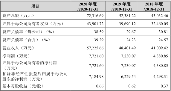2018年至2020年,公司营业收入分别为4.10亿元、4.84亿元及5.72亿元,年均复合增长率为18.13%。其中,主营业务占比分别为98.30%、99.08%和99.17%。