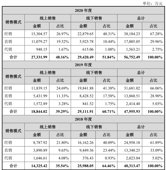 若按照销售情况划分,线下销售仍然是主力,不过占比正在逐年降低,线上销售比例在2020年已经提升至48.16%。其中,无论是线上或线下,产品均以经销商销售为主,直销占比较低。线上的直销占比正在逐年提升。
