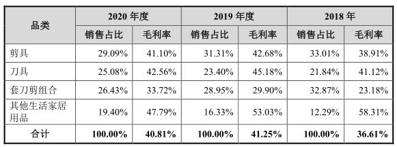 主营业务具体拆分到产品上看,剪具、刀具及套装组合占比较为均衡,2020年三项产品的占比分别为29.09%、25.08%和26.43%。