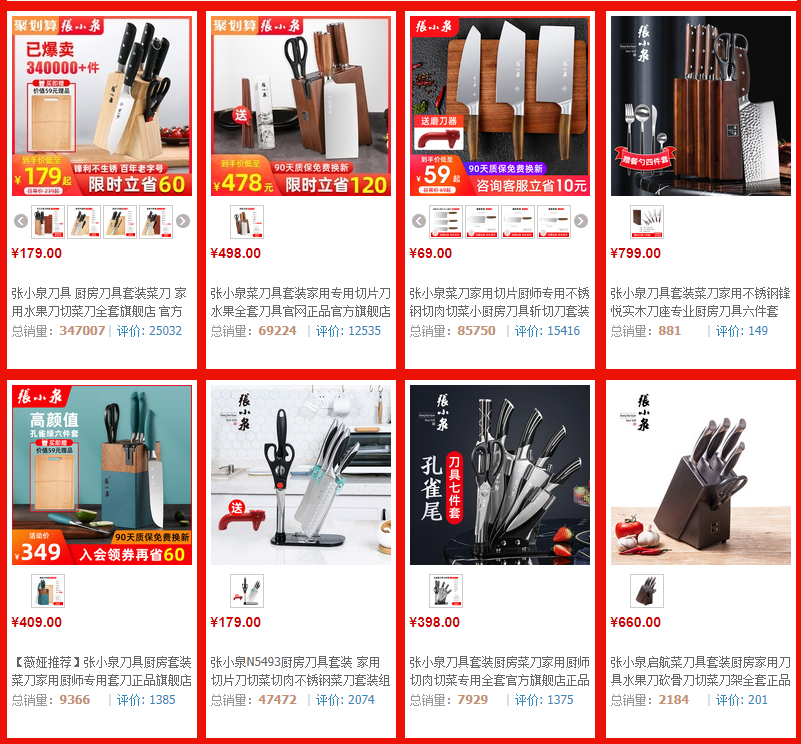 而张小泉旗舰店最贵的套装也不足1000元,但是销量已经骤降至几百个。