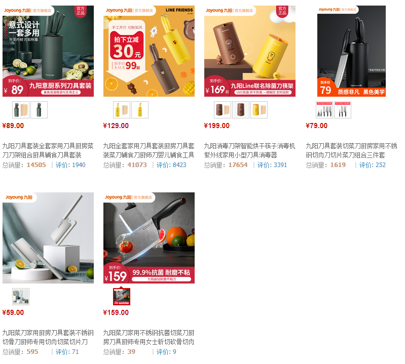 简单对比九阳电器,旗舰店一共拥有6款刀具组合,销量最高4万多,价格129元。