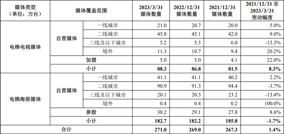 电梯电视媒体自营设备约83.3万台(包括境外子公司的媒体设备约 11.3 万台),覆盖国内 92个主要城市、香港特别行政区以及韩国、印度尼西亚、泰国、新加坡和马来西亚等国的70个主要城市;