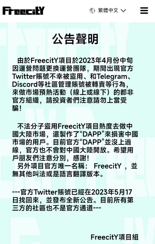 然后就是侮辱人智商的事情发生了,Freecity自由之城,官方推特直接发一个公告,说自己推特账号被盗了,4月中旬到5月17日之前所有的关于Freecity自由之城的推特内容均与官方无关,中国大陆事项与其无关。至于真假,大家猜猜看呢?
