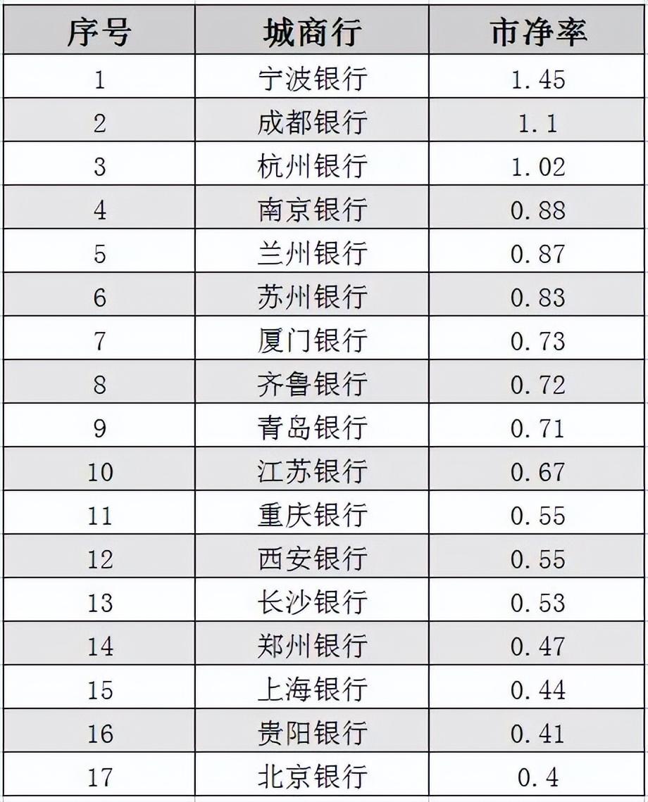 以市净率为例,2022年,在17家城商行中市净率大于1的银行屈指可数,其中宁波银行、成都银行和杭州银行分别以1.45、1.1 和1.02的市净率排在榜首。而其它银行则表现一般,北京银行因为0.4的市净率惨遭垫底。