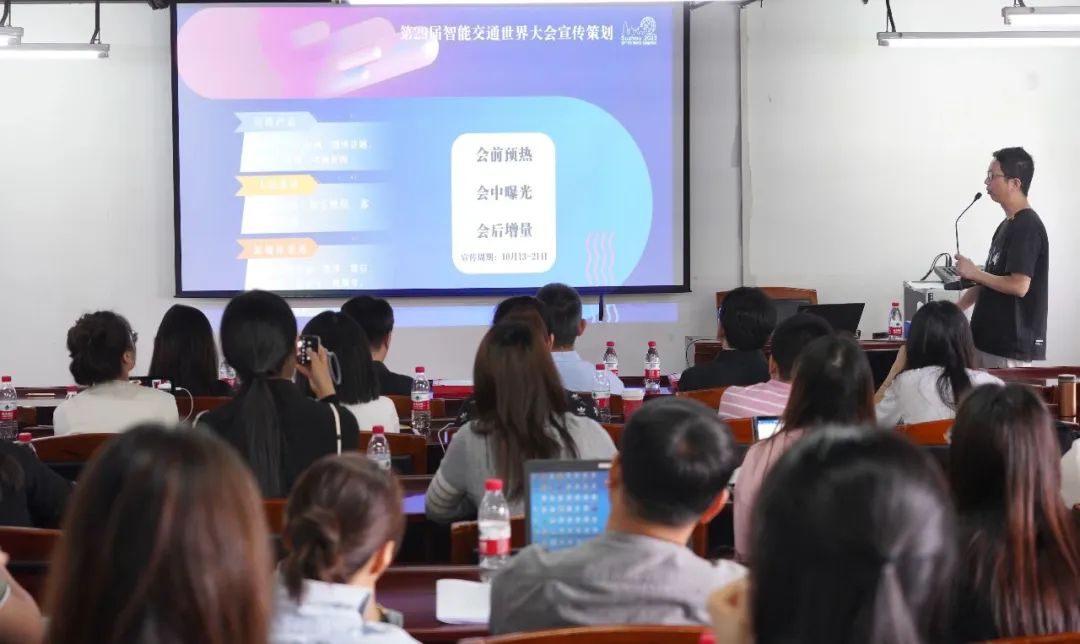 结业仪式上,苏州日报学员在分享小组成员头脑风暴的成果:第29届智能交通世界大会融媒体策划方案。