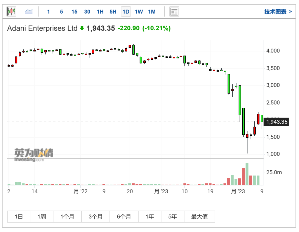 MSCI声明发布后,Adani Group股价早盘下跌10%,此前该股一度跌至多年低点。Adani传输、燃气和电力均下跌5%,而Adani港口和经济特区一度下跌近9%。在Hindenburg Research1月24日发布做空报告后,该集团的市值在过去两周大幅蒸发,缩水幅度一度高达1170亿美元。