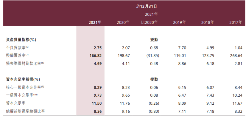 近年来,锦州银行持续加大清收处置工作力度,截至2021年末,不良贷款率为2.75%,拨备覆盖率为166.82%。