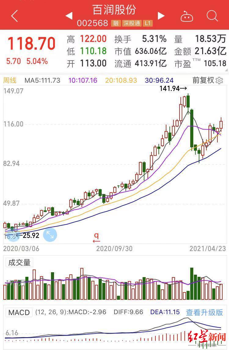百润股份也成为去年以来的股市大黑马之一,股价从20元左右一路扶摇直上,最高涨到140元以上。近期虽有回落,但截至4月23日仍有118.70元,总市值636亿元。