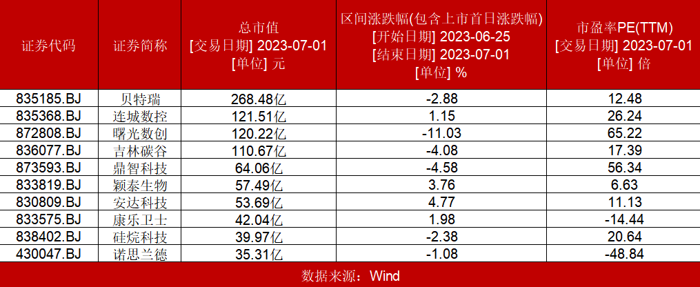 个股方面,北交所市值排名前十的个股,涨跌互现。“市值一哥”贝特瑞跌幅2.88%;连城数控涨幅1.15%;曙光数创跌幅11.03%;吉林碳谷跌幅4.08%;鼎智科技跌幅4.58%;颖泰生物涨幅3.76%;安达科技涨幅4.77%;康乐卫士涨幅1.98%;硅烷科技跌幅2.38%;诺思兰德跌幅1.08%。