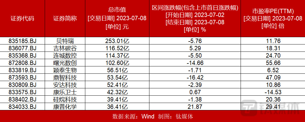 个股方面,北交所市值排名前十的个股,涨跌互现。“市值一哥”贝特瑞跌幅5.76%;吉林碳谷涨幅5.29%;连城数控跌幅5.50%;曙光数创跌幅14.66%;颖泰生物跌幅1.71%;鼎智科技跌幅16.42%;安达科技跌幅2.39%;康乐卫士涨幅0.67%;硅烷科技跌幅1.38%;康普化学涨幅21.87%。