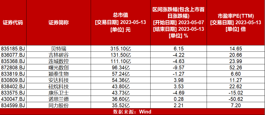 个股方面,北交所市值排名前十的个股,涨跌互现,贝特瑞涨幅6.15%;吉林碳谷跌幅4.22%;连城数控跌幅4.63%;曙光数创跌幅9.57%;颖泰生物跌幅1.27%;安达科技涨幅3.98%;硅烷科技涨幅3.53%;康乐卫士跌幅4.69%;诺思兰德涨幅0.28%;同力股份涨幅2.21%。