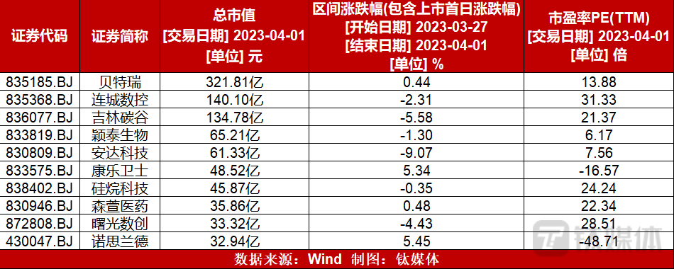 个股方面,北交所市值排名前十的个股中,涨跌互现。贝特瑞涨幅0.44%;连城数控跌幅2.31%;吉林碳谷跌幅5.58%;颖泰生物跌幅1.30%;次新股安达科技跌幅9.07%;康乐卫士涨幅5.34%;硅烷科技跌幅0.35%;森萱医药涨幅0.48%;曙光数创跌幅4.43%;诺思兰德涨幅5.45%。