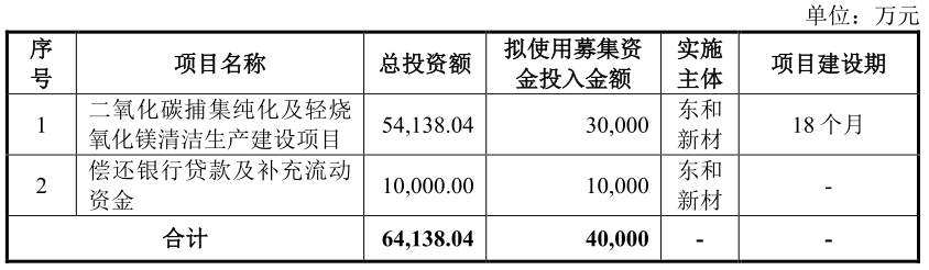 公司本次募投项目包括二氧化碳捕集纯化及轻烧氧化镁清洁生产建设项目(扩产项目)和偿还银行贷款及补充流动资金。扩产项目计划建设周期18个月,建成后将能形成年捕集纯化二氧化碳15.2万吨及年产17.16万吨高活性轻烧氧化镁。