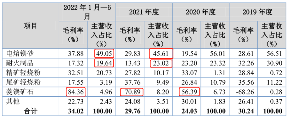 从营收结构上看,电熔镁砂占公司营收比例最高,2021年达到了45.61%,而耐火制品只占比23.02%。