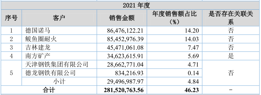 公司下游客户包括国际知名的耐火材料企业鲅鱼圈耐火、黑崎铁瑞等,国内外知名钢铁企业阿赛洛米塔尔、印度塔塔布衫等。