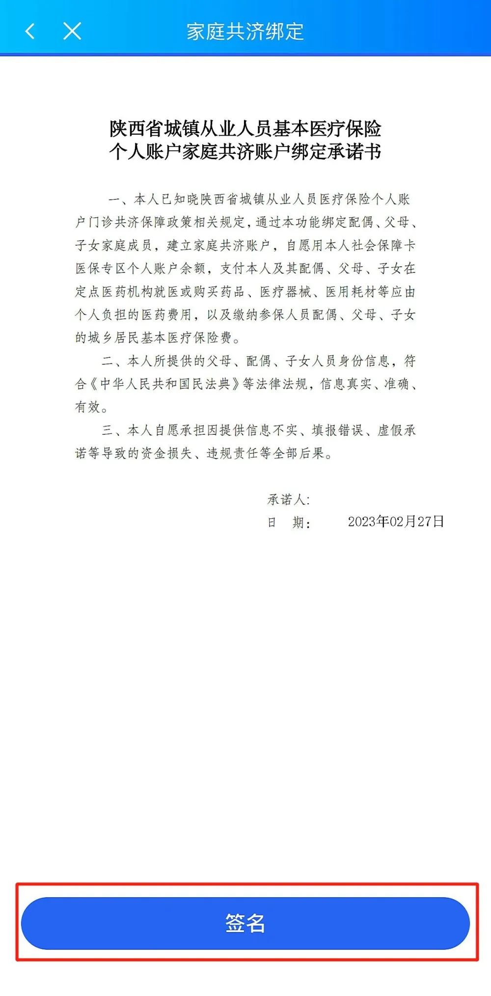 APP 后,点击页面底部的“服务”菜单,在服务菜单页面中,选择进入“家庭共济绑定”菜单,进入页面后仔细阅读告知书内容,阅读完成后勾选“已阅读个人账户共济绑定告知书”,点击“我已阅读并同意”按钮,进入家庭共济页面填写信息。