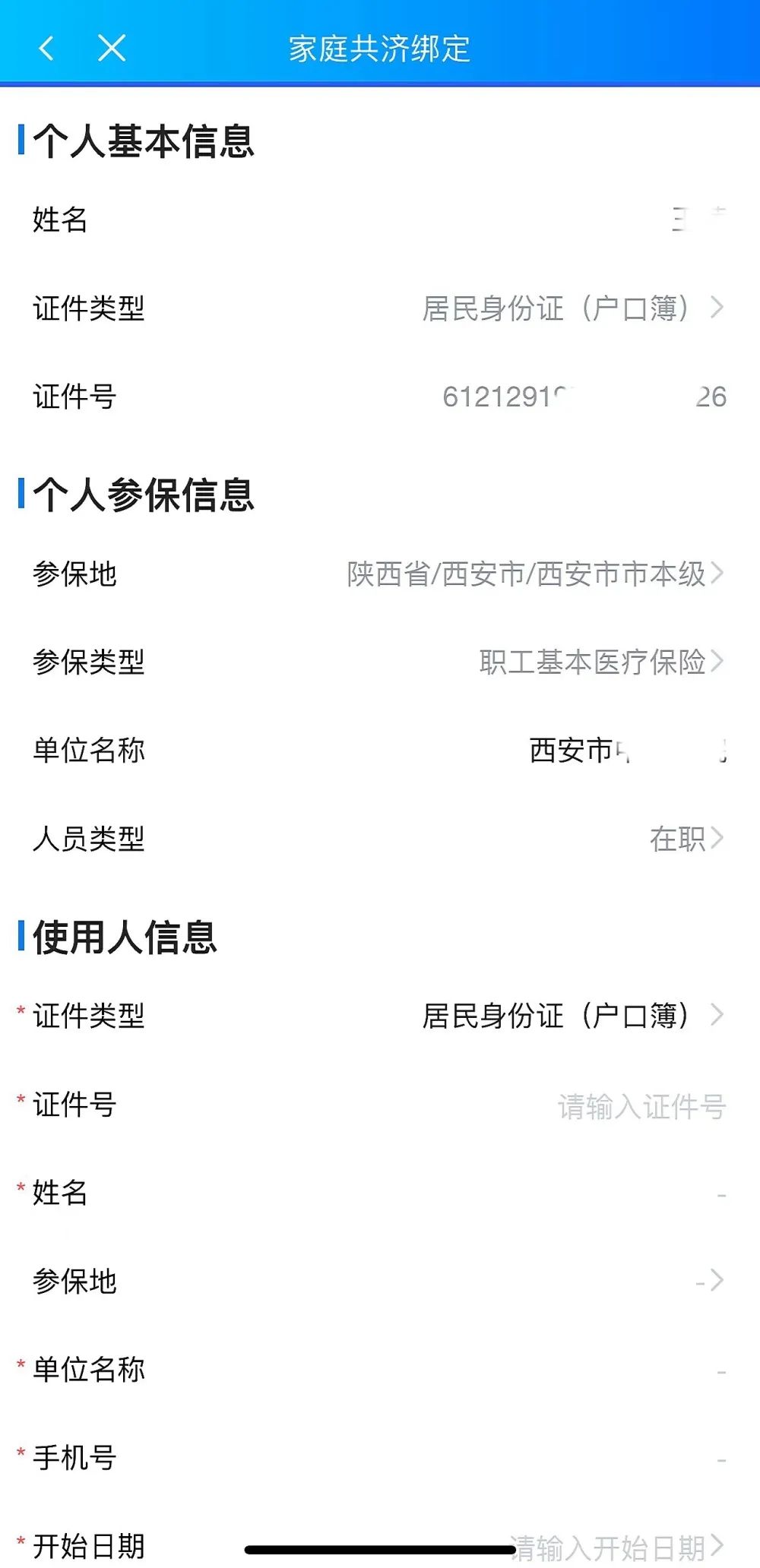 在信息填写页面填写使用人的信息,其中包括证件号、姓名、参保地、单位名称(居民直接填写社区信息)、手机号、开始日期、结束日期等内容,然后查看个人承诺书并签名,点击提交,绑定完成。