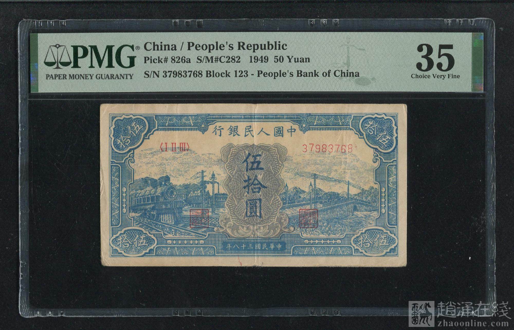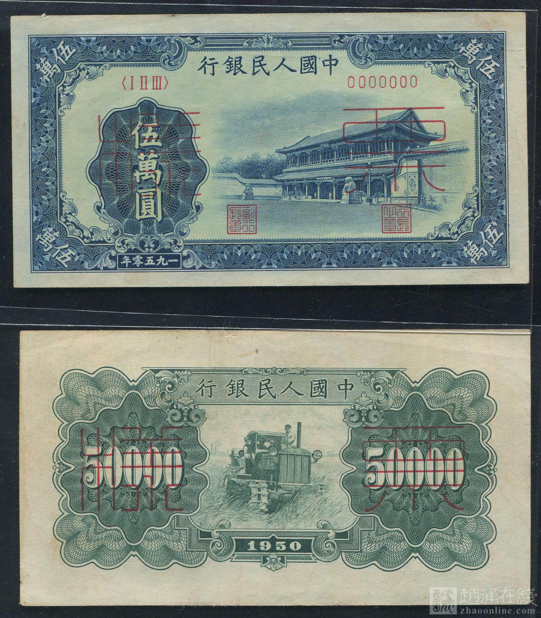 名称:第一版人民币新华门50000元正反面票样各一枚,共二枚
