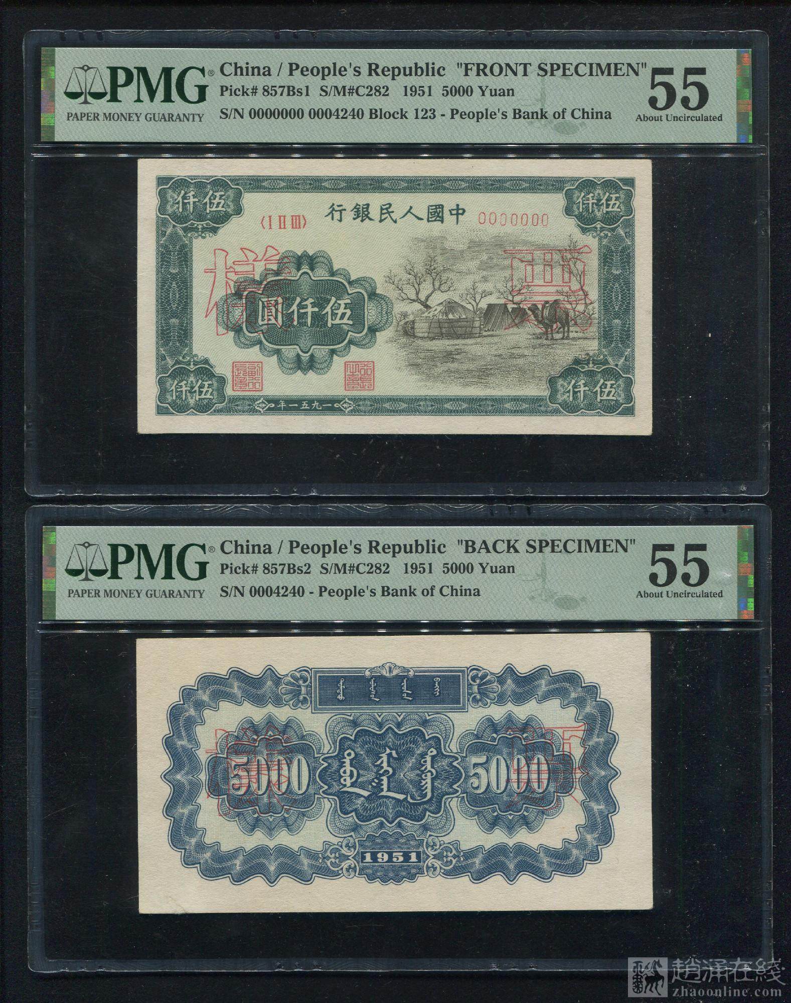 名称:第一版人民币蒙古包5000元正反面票样各一枚