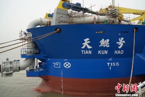 中新网上海12月1日电(张一凡) 亦霄览德聊追凤,沧海寻仙更踏鲲。作为国内首艘采用全电力驱动型式的自航绞吸式挖泥船,今年11月3日,“天鲲号”挖泥船在江苏启东下水。这艘由中国交建建造的“大国重器”,正如北冥之鲲一般高大伟岸。