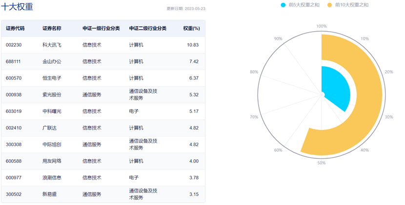 数据显示,截至2023年5月23日,该指数前十大权重股包括科大讯飞、金山办公、恒生电子、紫光股份、中科曙光等,前十大之和为55.68%。(数据来源:中证指数公司,指数成份股不代表个股推荐)