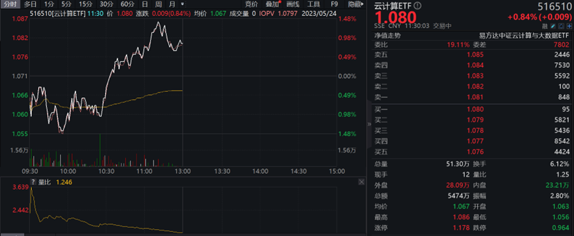 ETF方面,云计算ETF(516510)开盘回调后走高,截至午间收盘,该基金收涨0.84%,报1.08元,市场交投活跃。