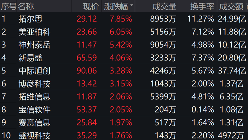 指数成分股中,拓尔思上涨7.85%,美亚柏科上涨6.05%,神州泰岳上涨5.42%,新易盛、中际旭创等个股跟涨。