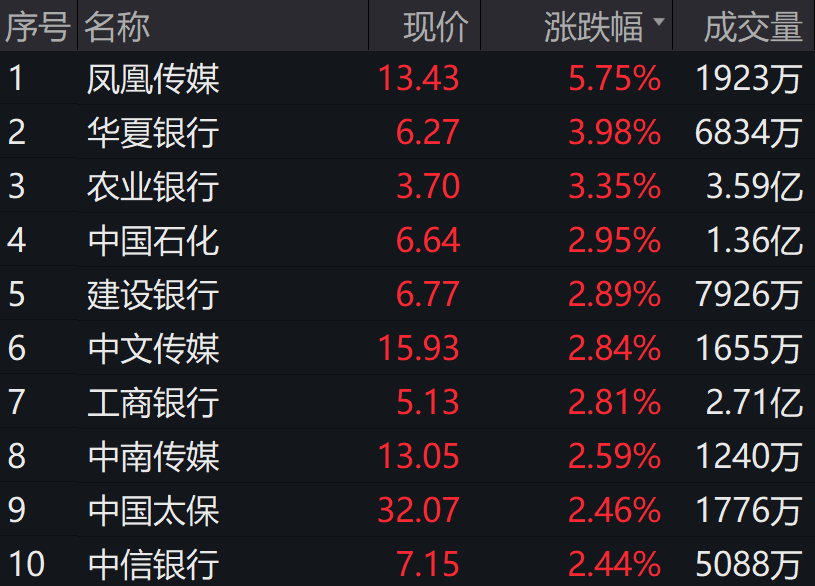 指数成分股中,传媒和银行股涨幅靠前。其中凤凰传媒午盘收涨5.75%,华夏银行上涨3.98%,农业银行上涨3.35%,建设银行、工商银行、中信银行涨幅超2%,中文传媒、中南传媒等跟涨。