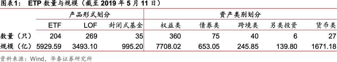 我国的ETP按产品形式可分为交易型开放式指数证券投资基金(Exchange Traded Fund,简称ETF)、上市开放式基金(Listed Open-Ended Fund,简称LOF)、封闭式基金和分级基金;按资产类别可分为权益类、债券类、跨境类、另类投资类和货币类。根据Wind数据统计,截至2019年5月11日,除去分级基金,我国大陆地区ETP总数目为508,总规模约为10417.89亿。