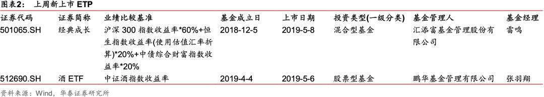 汇添富基金的经典成长(501065.SH)于2019年5月8日上市,由雷鸣任基金经理。该基金业绩比较基准为沪深300指数收益率*60%+恒生指数收益率(使用估值汇率折算)*20%+中债综合财富指数收益率*20%。鹏华基金的酒ETF(512690.SH)于2019年5月6日上市,由张羽翔任基金经理。该基金业绩比较基准为中证酒指数收益率(399987.SZ)。