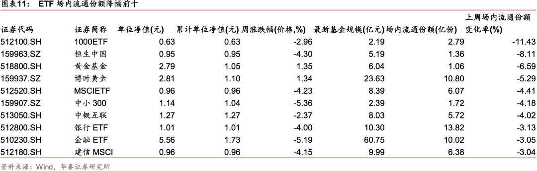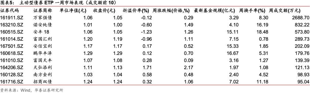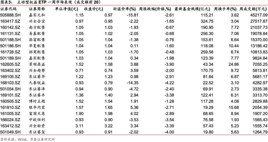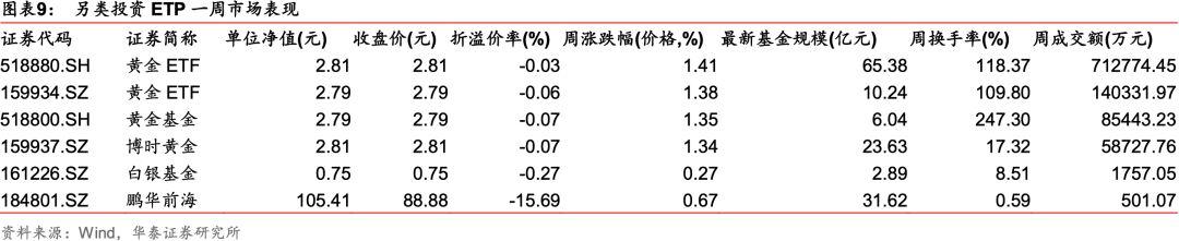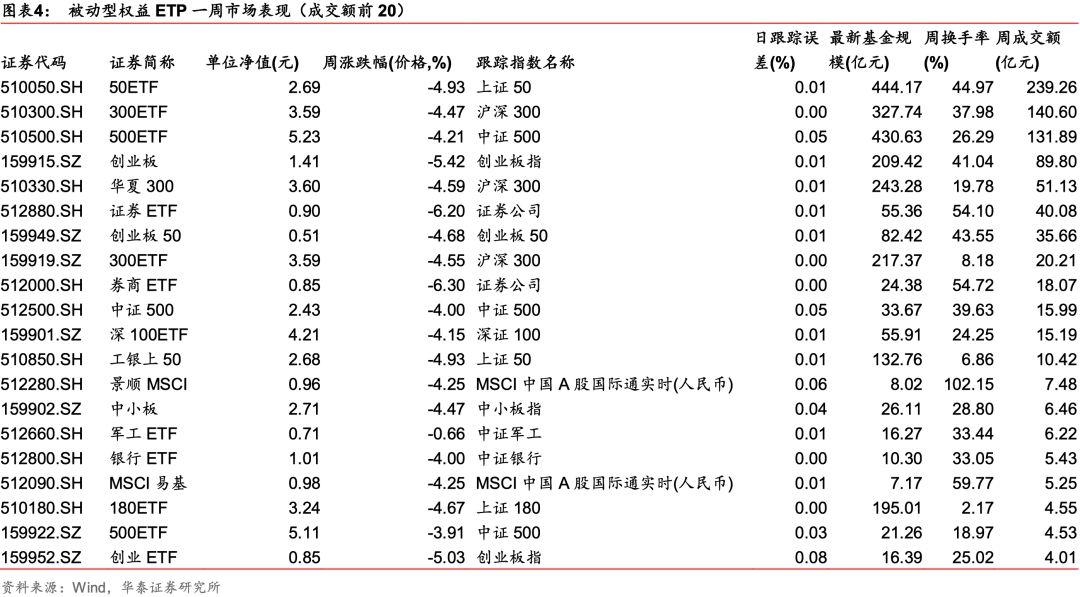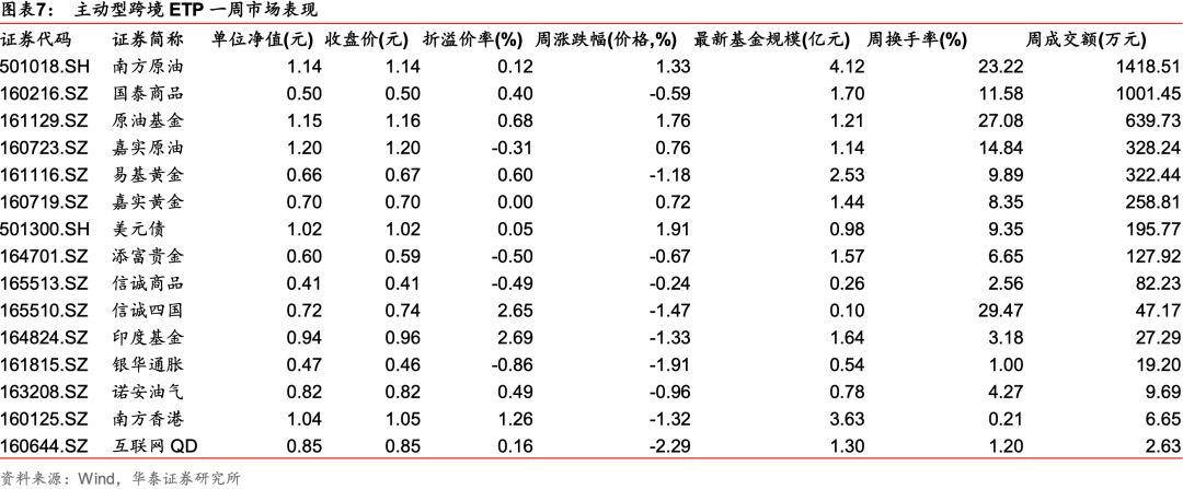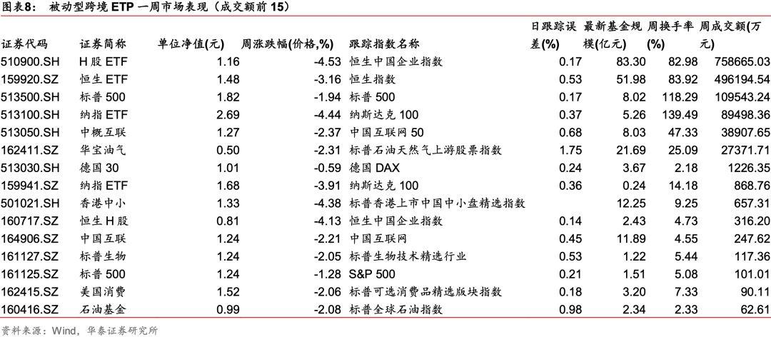 上周权益类ETP全面收跌,被动型权益ETP跌幅更大,大盘风格、小盘风格、券商板块、创业板表现均不佳;债券ETP多数小幅上涨,成交额前10的主动型和被动型债券ETP悉数上涨;跨境ETP多数下跌,主动型表现优于被动型,成交额前15的主动型跨境ETP中有5只上涨,成交额前15的被动型跨境ETP悉数下跌,H股ETF(510900.SH)领跌;另类投资ETP中,贵金属ETP悉数上涨,鹏华前海(184801.SZ)结束两周下跌。