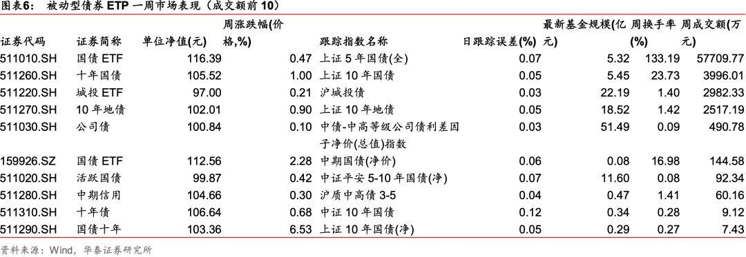 上周债券ETP多数小幅上涨。成交额前10的主动型债券ETP悉数上涨,天弘添利(164206.SZ)领涨,涨幅为2.17%。成交额前10的被动型债券ETP全部上涨,涨幅差异较大,国债十年(511290.SH)涨幅居首,为6.53%。