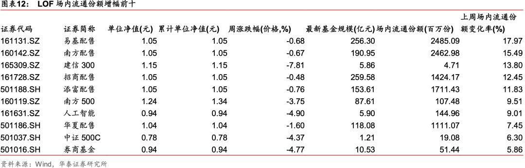 上周ETF中,国寿500(510560.SH)场内流通份额增幅最大,达74.64%,1000ETF(512100.SH)场内流通份额降幅居首,上周降幅为11.43 %;上周LOF中,易基配售(161131.SZ) 场内流通份额涨幅最大,为17.97 %;银河通利(161505.SZ)场内流通份额降幅最大,上周降幅达35.01 %,目前场内流通份额仅为742万份。