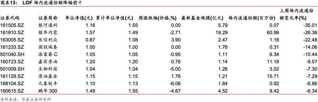 上周LOF中,易基配售(161131.SZ) 场内流通份额涨幅最大,为17.97 %,流通份额增至2485.09百万份。银河通利(161505.SZ)场内流通份额降幅最大,上周降幅达35.01 %,目前场内流通份额仅为742万份。