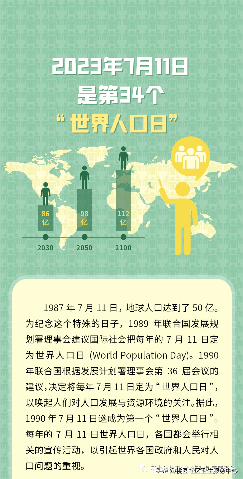1987年7月11日,地球人口达到了50亿。为纪念这个特殊的日子,1989年联合国发展规划署理事会建议国际社会把每年的7月11日定为世界人口日(World Population Day)。1990年联合国根据发展计划署理事会第36届会议的建议,决定将每年7月11日定为“世界人口日”,以唤起人们对人口发展与资源环境的关注。据此,1990年7月11日遂成为第一个“世界人口日”。每年的7月11日世界人口日,各国都会举行相关的宣传活动,以引起世界各国政府和人民对人口问题的重视。2023年7月11日是第34个世界人口日。