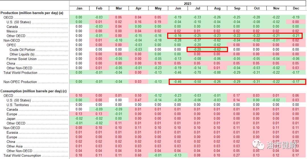 ,其中OPEC产量预期下调集中在7-8月,主要因为沙特自愿加深减产;相比之下,俄罗斯产量下调幅度相对有限。但从全球供应来看,此次月报EIA