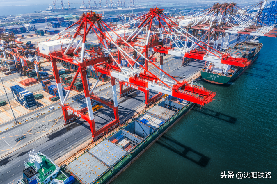 锦州港内,大小船舶井然有序,整齐码放的集装箱被装上列车,一派繁忙的装卸运输景象。